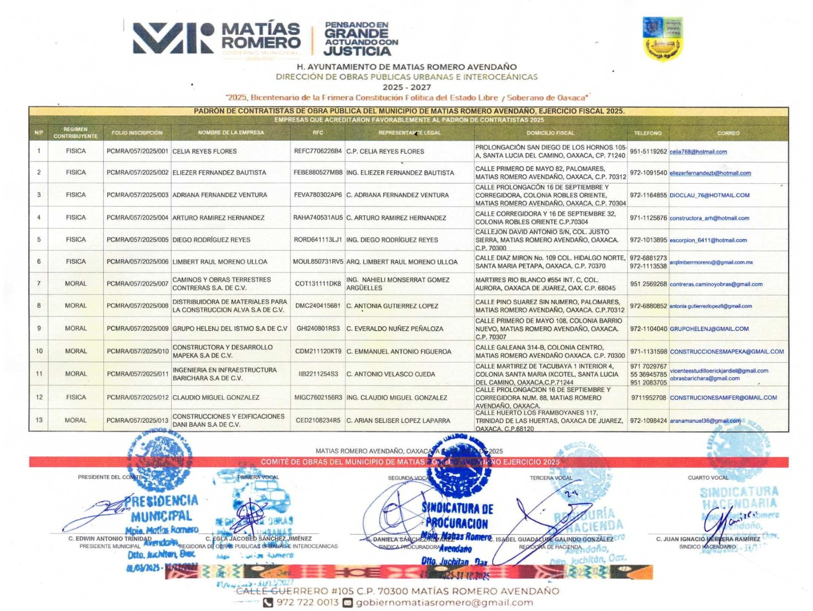 Padrón de Contratistas de Obra Pública. Ejercicio Fiscal 2025.